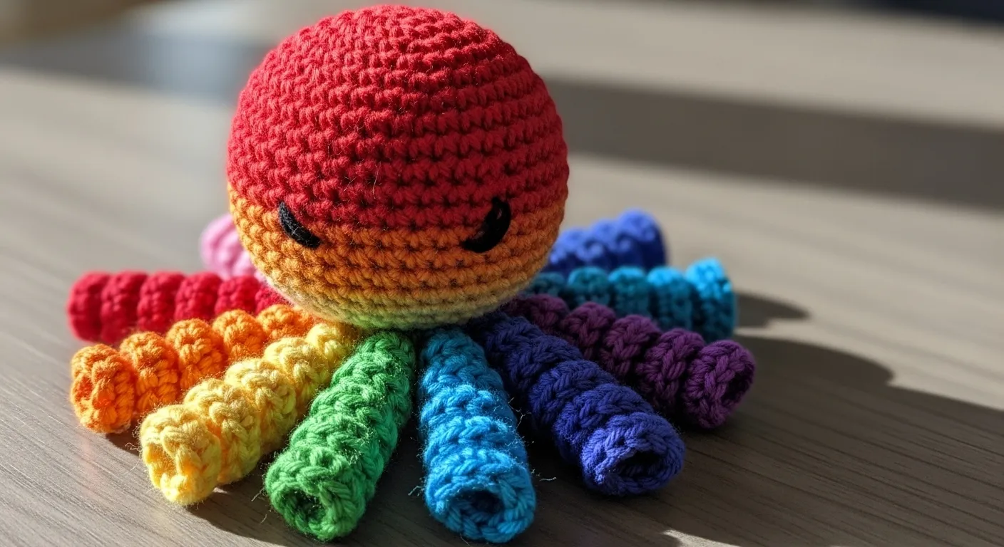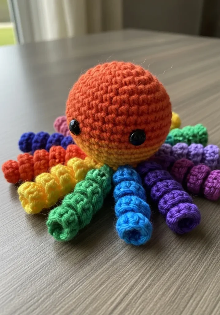 This cheerful crochet octopus is made with soft acrylic yarn in bold rainbow shades, featuring a bright coral head and curly tentacles in every color of the spectrum. The stitches are tight and neatly worked in spirals, giving the body a smooth, rounded shape, while the tentacles have a playful coiled texture that adds movement and charm. Tiny black safety eyes bring the whole piece to life, and the subtle yarn fuzz gives it that cozy handmade feel.