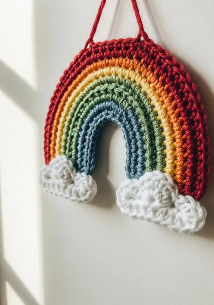 This crochet wall hanging features a bold arched rainbow in vibrant red, orange, yellow, green, and blue, finished with fluffy white cloud details at the ends. The stitches are simple and clean, creating smooth color blocks that pop against a neutral wall. The slight yarn texture gives it a soft, handmade depth.