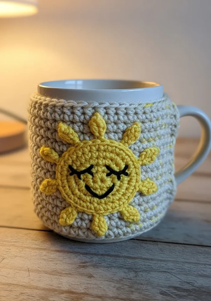 This crochet mug cozy is wrapped in soft blue yarn and decorated with a bright yellow smiling sun stitched on the front. The rays are slightly raised, adding texture and dimension, while the cozy fits snugly around a standard mug. The cheerful face and warm colors give it instant personality.