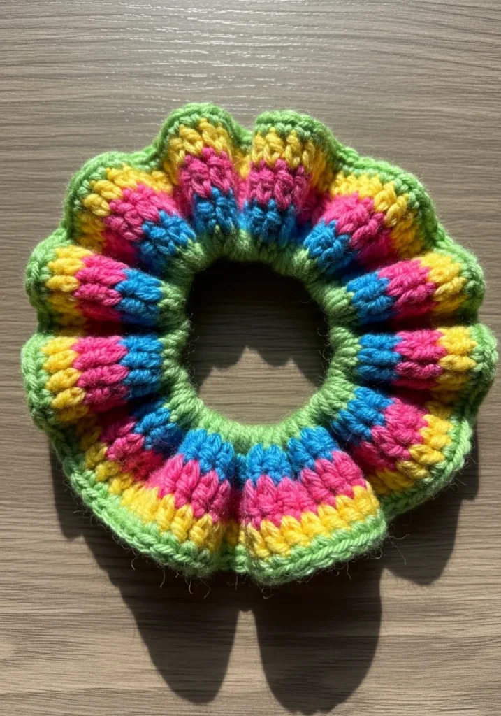 This bright crochet scrunchie is worked in cheerful rainbow stripes with a flouncy ruffled edge that forms soft scallops all the way around. The stitches are slightly textured, giving it that cozy handmade feel, and the bold mix of pink, yellow, green, and blue makes it instantly eye catching. The circular shape is full and bouncy, with subtle yarn fuzz that adds warmth and charm.