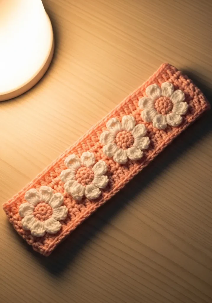 This crochet headband features a row of small granny square flowers in warm peach and cream tones, joined together into a comfortable band. The floral motifs add texture and a soft vintage touch, while the structured shape keeps it neat and wearable. The yarn has a slight fuzz that enhances its cozy handmade look.