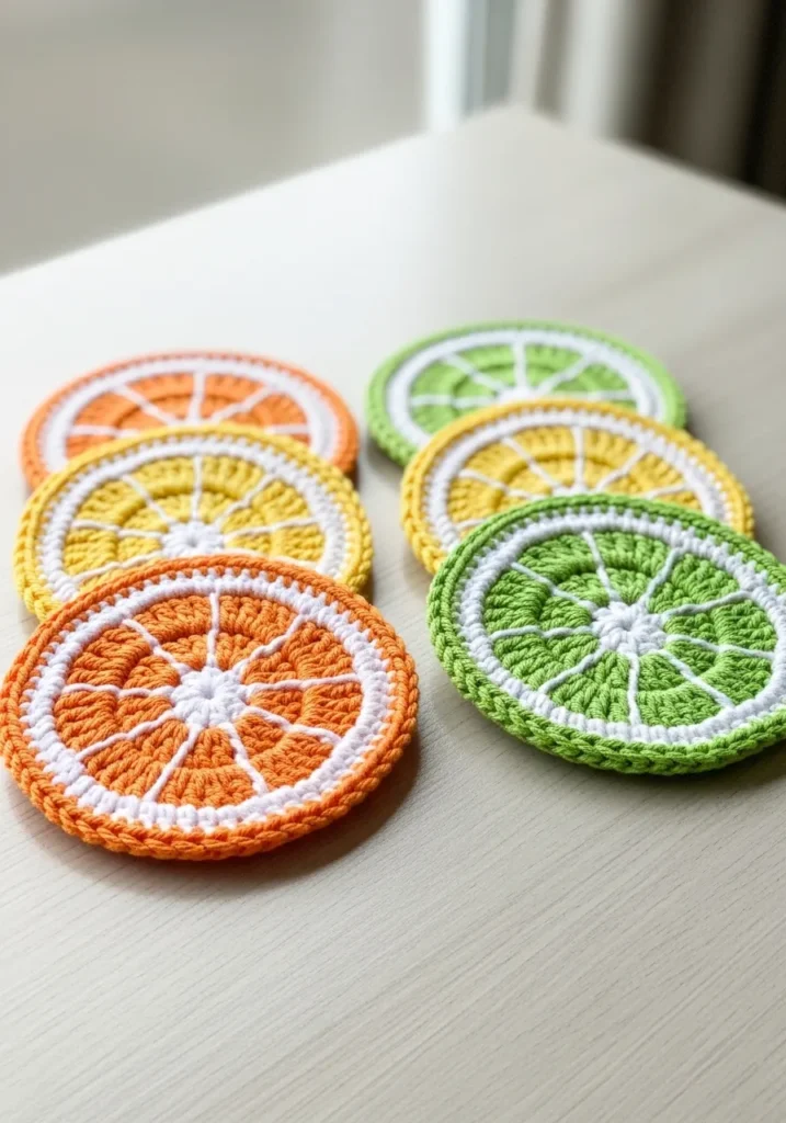 These crochet coasters are designed to look like bright orange and lime slices, complete with white segment details and vibrant outer rinds. The circular shape is clean and bold, and the contrasting colors make the fruit design pop beautifully. The stitches are slightly textured, giving each coaster a fresh handmade feel.