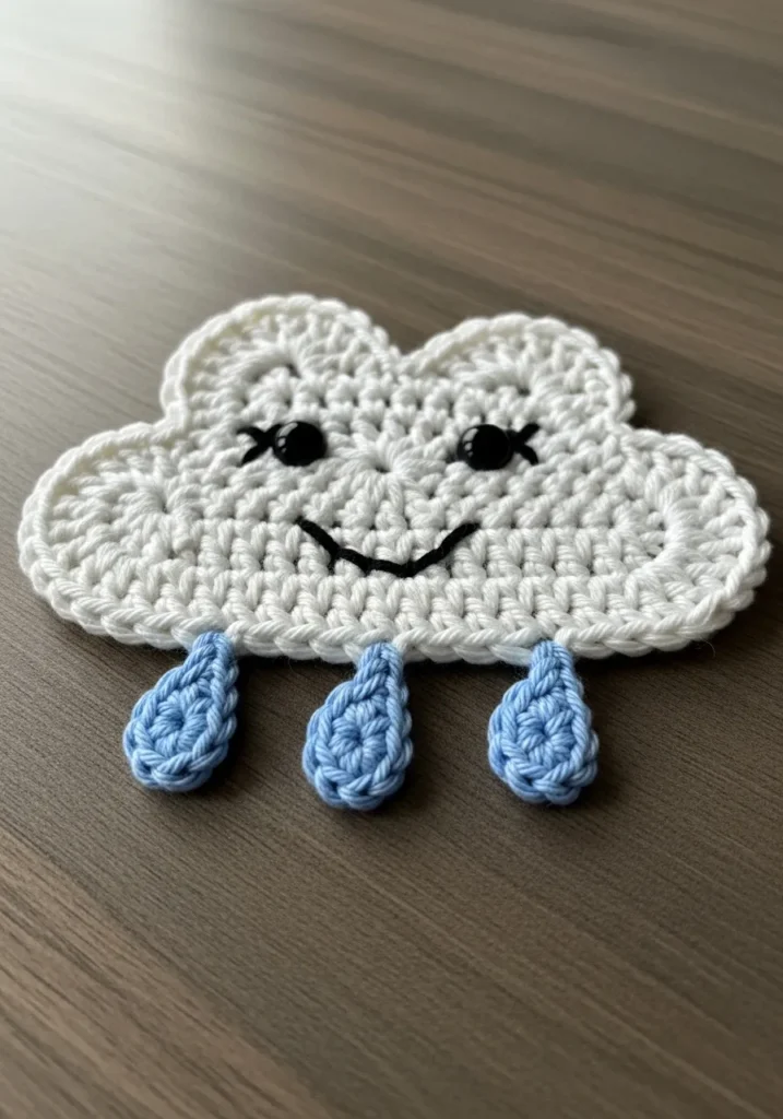 This sweet crochet cloud features a soft white puff shape with stitched sleepy eyes and tiny blue raindrop details hanging below. The texture is plush and slightly fluffy, giving it a dreamy look. The simple shaping keeps the design clean, while the face adds personality.
