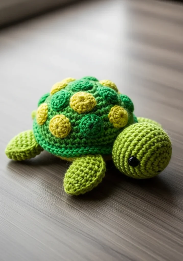 This adorable little turtle features a soft green body and a domed shell decorated with raised yellow and deep green bobble stitches. The textured shell adds depth and personality, while the rounded head and flipper style legs keep the design sweet and simple. The yarn has a gentle fuzz that enhances the cozy handmade look, and the smooth black eyes give it a calm, lovable expression.