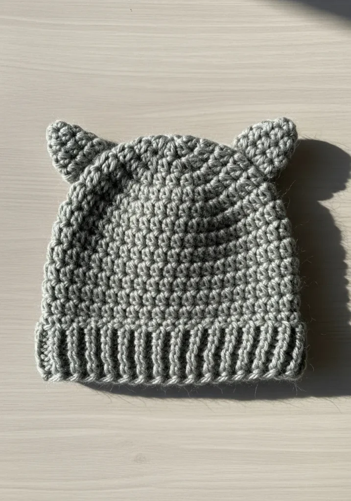 This cozy gray crochet beanie is topped with subtle pointed cat ears that blend right into the rounded shape. The ribbed brim adds stretch and texture, while the body of the hat is worked in neat, even stitches. The neutral color keeps it versatile, and the soft yarn gives it that snug handmade feel.