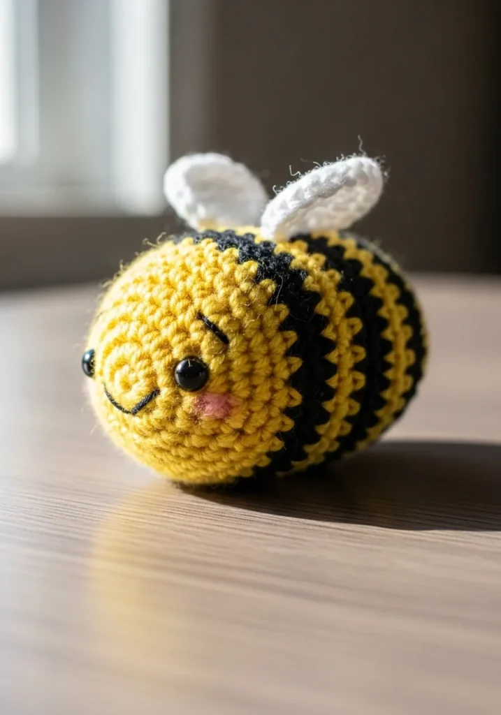 This tiny crochet bumblebee is worked in bright yellow and black stripes with small white wings on top. The round body and glossy black eyes give it an adorable, cuddly look. The stitches are tight and slightly textured, creating a sturdy but soft plush feel.