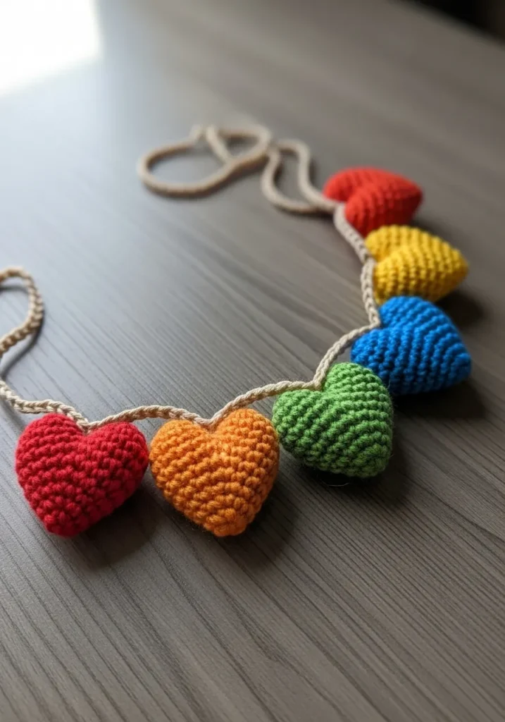This sweet crochet garland features a row of plump, softly stuffed hearts in bold rainbow shades including red, orange, yellow, green, and blue. Each heart is tightly stitched with smooth, even rounds that give them a neat and slightly textured surface. They are strung together with a simple neutral yarn chain that keeps the focus on the bright colors while adding a handmade charm. The hearts are evenly spaced, creating a cheerful and balanced design that feels playful yet cozy.