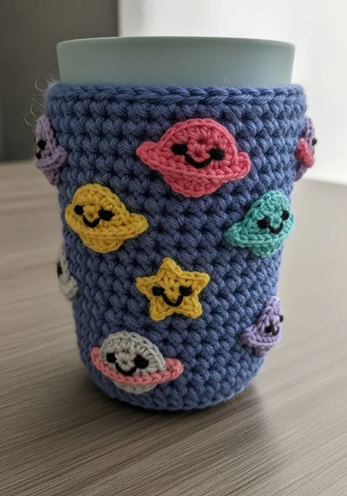 This adorable crochet mug cozy is worked in a soft denim blue yarn and decorated with tiny smiling planets and a cheerful yellow star appliqué. The chunky stitches create a thick, cozy texture that wraps snugly around a cup, while the pastel planets in pink, mint, and lavender add a whimsical space theme. The small stitched faces give each little planet its own personality, making the whole piece feel fun and lighthearted.