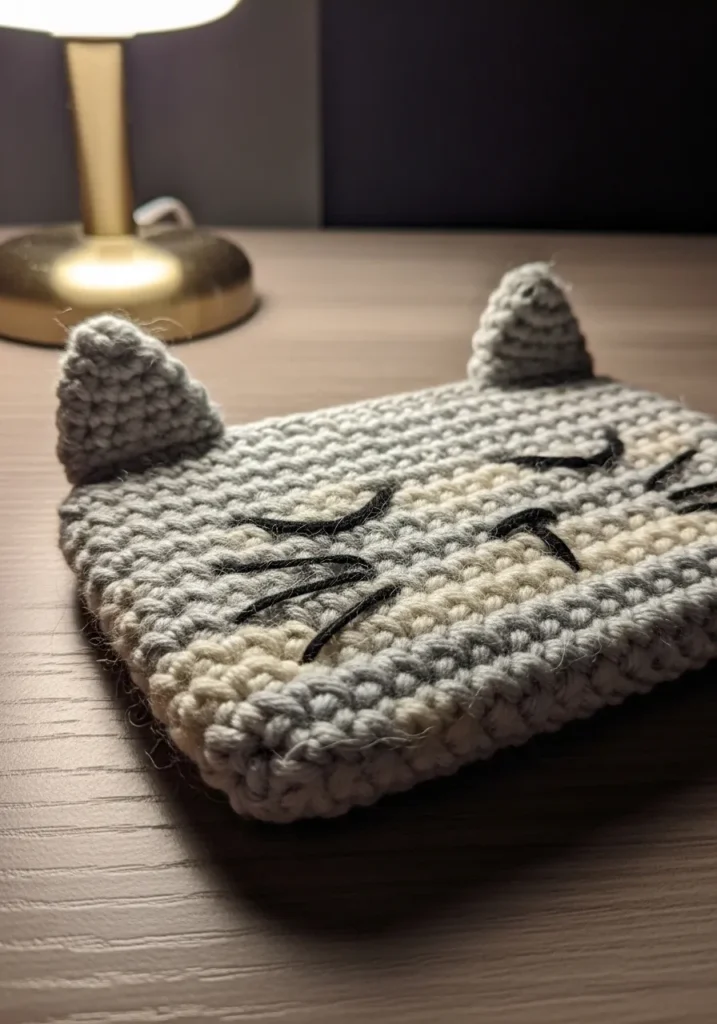 This soft gray crochet pouch is designed with tiny cat ears at the top and stitched sleepy eyes across the front. The texture is slightly chunky, giving it a plush and cozy vibe, and the simple shaping keeps the overall look clean and modern. The neutral yarn color makes it versatile, while the playful face detail adds personality.