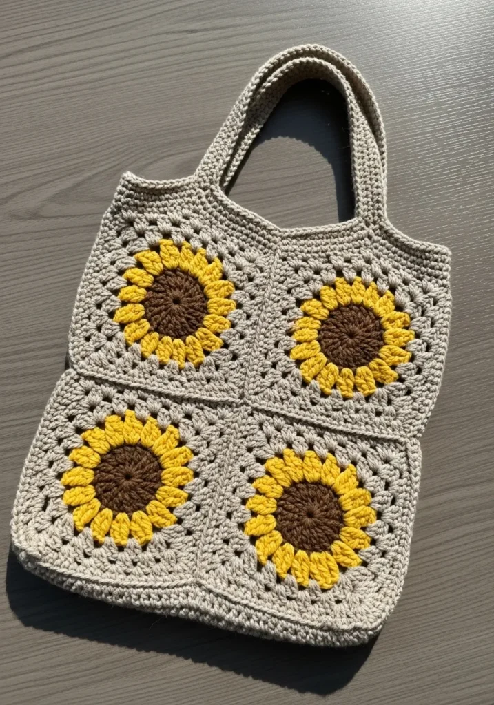This crochet tote bag is built from classic granny squares featuring bold sunflower motifs in warm yellow and rich brown centers. The cream colored background keeps the design fresh and balanced, while the sturdy straps and structured shape make it functional for everyday use. The floral squares add texture and a pop of color that instantly catches the eye.