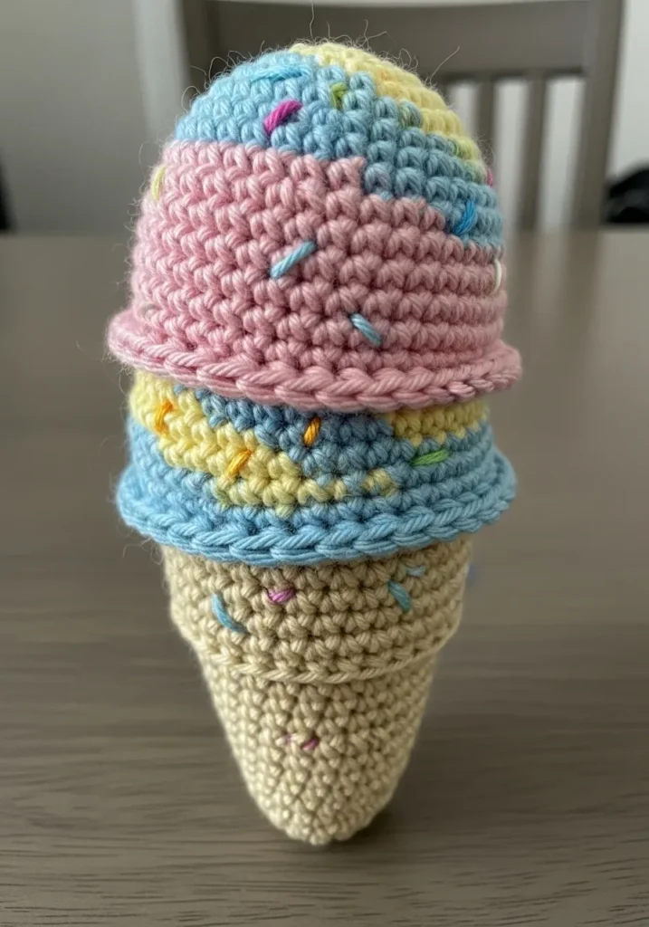 This sweet crochet ice cream features stacked pastel scoops in soft pink, blue, and yellow, all sitting on a textured cone base. The stitches create a gently ridged look that mimics real ice cream swirls, and the color transitions add playful charm. The soft yarn fuzz enhances the dessert inspired coziness.