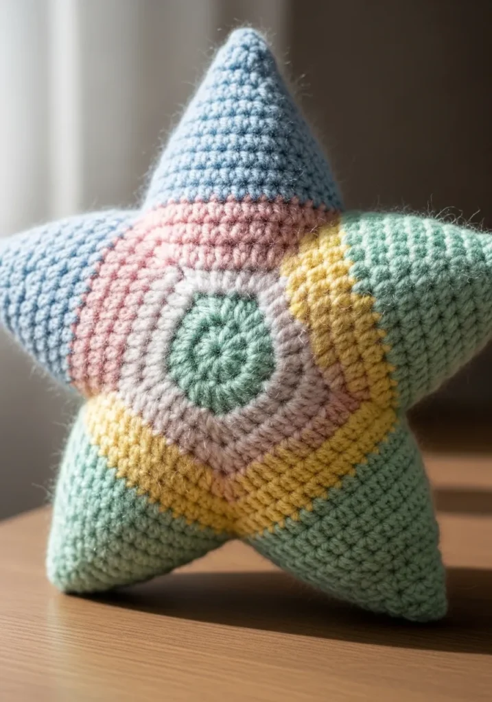 This plush star pillow is crocheted in pastel sections of mint, blush, yellow, and sky blue, all meeting at a circular center. The five pointed shape gives it a whimsical, dreamy look, and the lightly textured stitches add dimension without overwhelming the design. The stuffing creates a gently rounded, squishy finish.