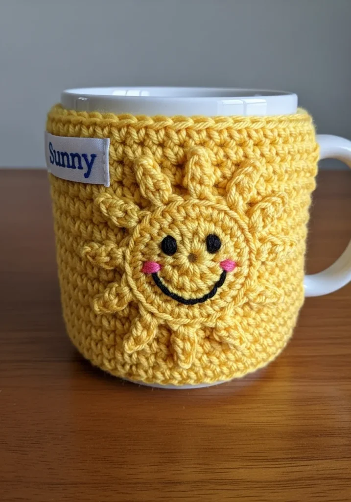 This cheerful crochet mug cozy is stitched in a bright sunflower yellow yarn with a textured bobble pattern that frames an adorable smiling face in the center. The cozy wraps snugly around a simple ceramic mug, adding both insulation and personality. The stitches are chunky and defined, giving it a soft, cushioned feel, and a small personalized tag on the side adds that thoughtful finishing touch. The overall design is playful yet practical, perfect for morning coffee or afternoon tea.