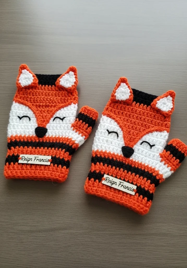 These adorable crochet fingerless gloves are designed with cute fox faces on the back, complete with tiny ears and stitched sleepy eyes. The bright orange yarn contrasts with white and black accents, creating a bold and cozy look. The ribbed cuffs add stretch and comfort, and a small personalized tag near the wrist adds that thoughtful handmade touch. The texture is soft and warm with clearly defined stitches.