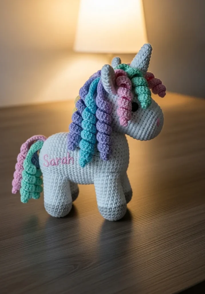 This dreamy crochet unicorn plush is worked in soft pastel shades with a gently textured body and a flowing mane in blended yarn colors. A small stitched name detail adds a personalized touch that makes it feel magical and custom made. The unicorn stands upright with a soft, stuffed shape and neat stitch definition that highlights its sweet features. The pastel palette gives it a gentle, whimsical vibe.