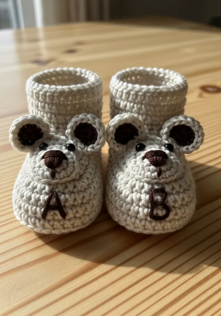 These tiny crochet baby booties are shaped like sweet little bears, complete with round ears and stitched sleepy eyes. Made in a soft cream yarn with darker brown accents for the ears and nose, they feel cozy and gentle to the touch. Each bootie features a bold embroidered initial on the front, turning them into a personalized keepsake. The stitches are tight and neatly worked, giving the slippers structure while still looking soft and cuddly.