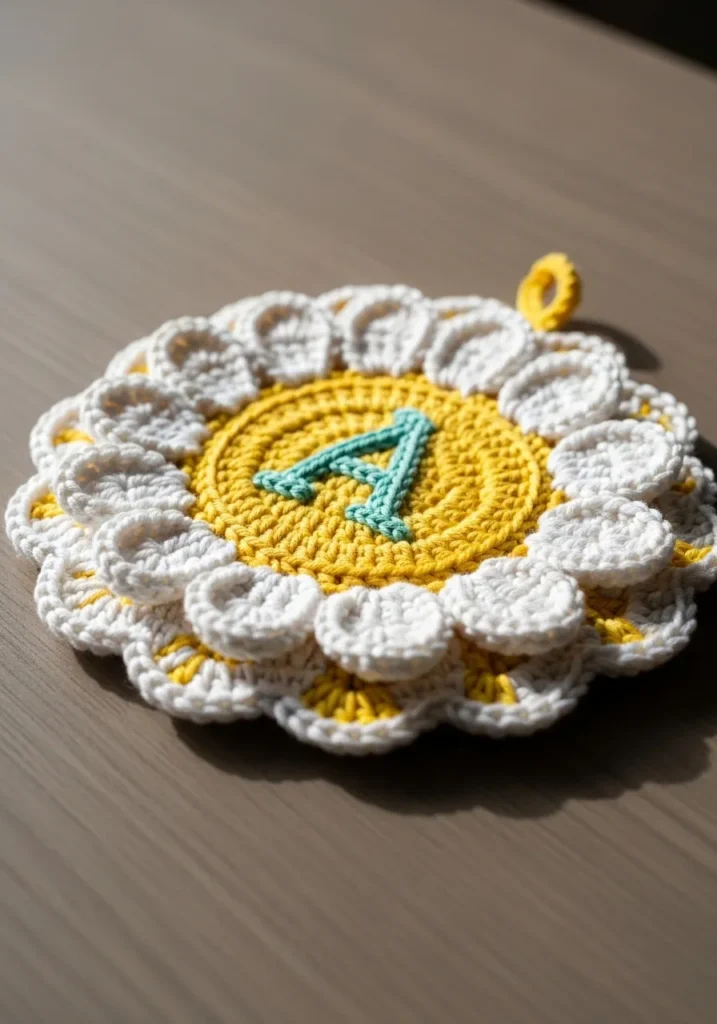 This round crochet coaster features layered white petals surrounding a sunny yellow center, with a contrasting initial stitched right in the middle. The petal texture adds dimension, and the circular shape gives it a polished finish. The bright colors pop beautifully against a neutral background, and the small hanging loop detail makes it easy to display or store. The stitches are clean and slightly raised, creating a lovely tactile feel.