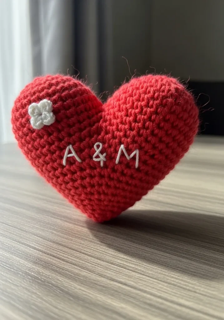 This bold red crochet heart is stitched in a classic amigurumi style with a soft, rounded shape and smooth texture. A tiny white flower detail adds a sweet accent near the top, while embroidered couple initials across the front make it deeply personal. The yarn is worked tightly so the stuffing stays neatly inside, giving it a firm yet squeezable feel. It stands upright beautifully on a simple surface.