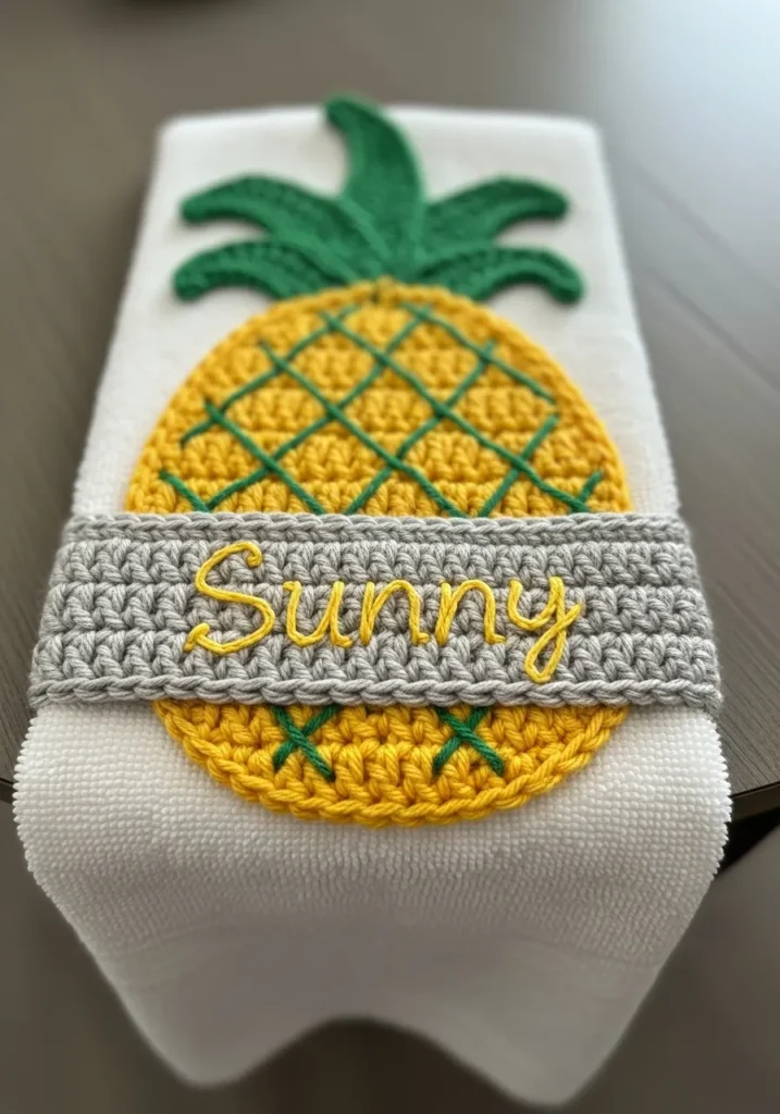 This cheerful crochet towel topper features a textured pineapple motif in bright yellow and green, stitched onto a soft white base. A bold embroidered name sits across a contrasting band, making it instantly personalized. The stitches create a fun raised grid pattern on the pineapple, adding visual interest and dimension. The design feels fresh and playful while still being practical for everyday use.