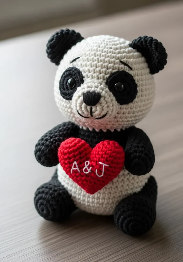 This sweet crochet panda is worked in classic black and white yarn with round ears and oversized eyes that give it a lovable expression. It holds a bright red heart with embroidered initials across the front, adding a romantic and personal touch. The stitches are even and tight, giving the plush a smooth finish and sturdy shape. Its small size makes it perfect for display on a shelf or bedside table.