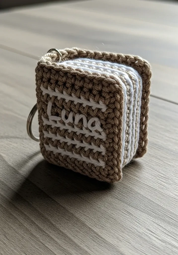 This adorable crochet mini book is stitched in neutral brown and cream yarn, shaped like a tiny closed novel with textured ridges along the edges to mimic pages. A name is embroidered across the front cover, turning it into a charming keepsake for book lovers. The compact rectangular shape is neat and structured, and the attached keyring makes it practical for everyday use. The stitching detail adds just enough dimension to make it instantly recognizable.