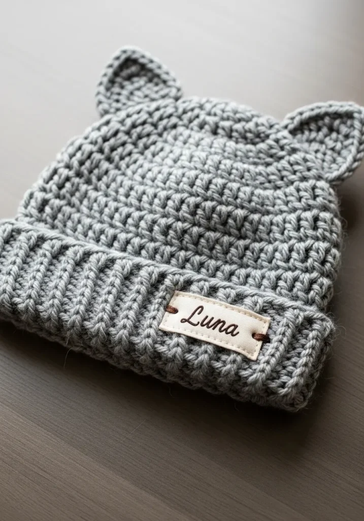 This cozy gray crochet beanie features sweet little cat ears stitched right into the top, giving it a subtle but playful shape. The ribbed brim adds stretch and texture, while the body is worked in smooth, even stitches for a clean finish. A small name patch sewn onto the fold makes it feel extra special and gift ready. The neutral yarn keeps it wearable, while the ear detail adds just enough whimsy.