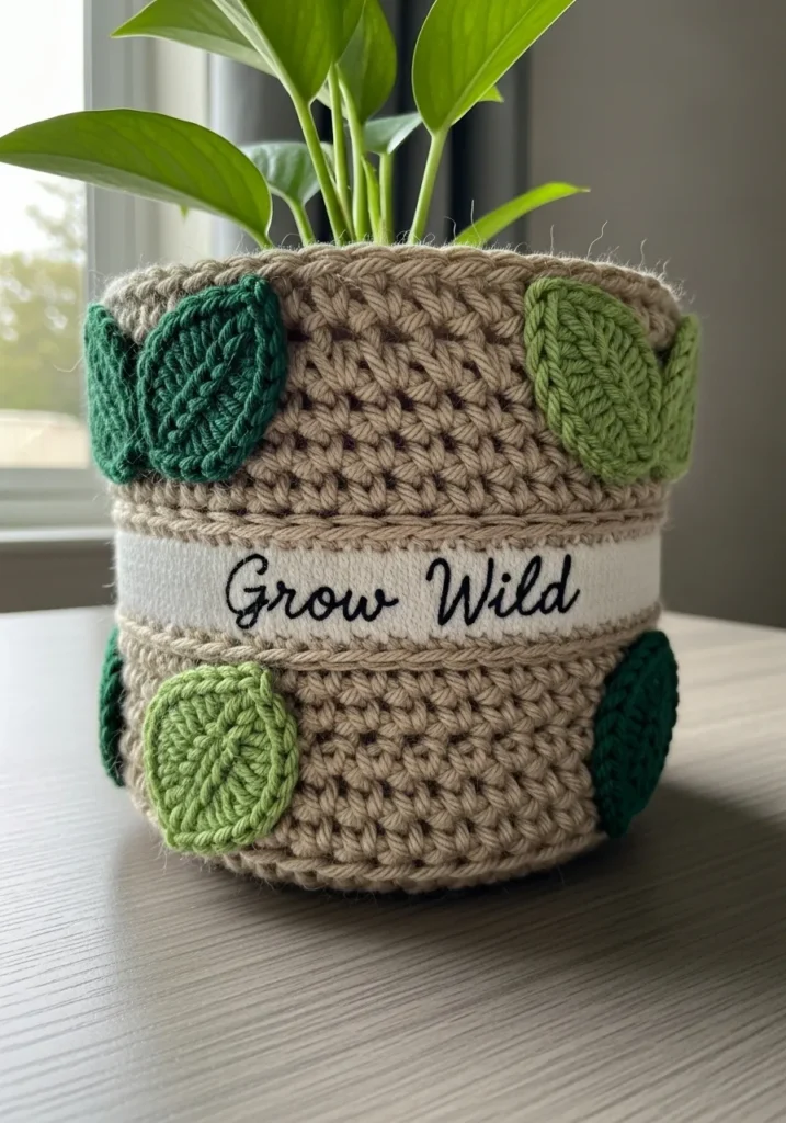 This crochet plant pot cover is made in a soft beige yarn with raised green leaf appliqués stitched around the sides. A stitched phrase band that reads Grow Wild wraps around the center, giving it a sweet, encouraging vibe. The texture is sturdy yet cozy, with visible stitch definition that adds warmth to any simple plant pot. The earthy tones and leafy accents make it feel natural and homey.