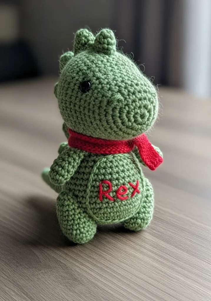 This adorable green crochet dinosaur is stitched in soft yarn with rounded features and tiny textured details along the back. A bright red scarf adds a pop of color, and the name stitched across its belly makes it completely one of a kind. The shape is plump and huggable, with neat, tight stitches that give it structure while still feeling soft. It stands upright beautifully on a simple tabletop.