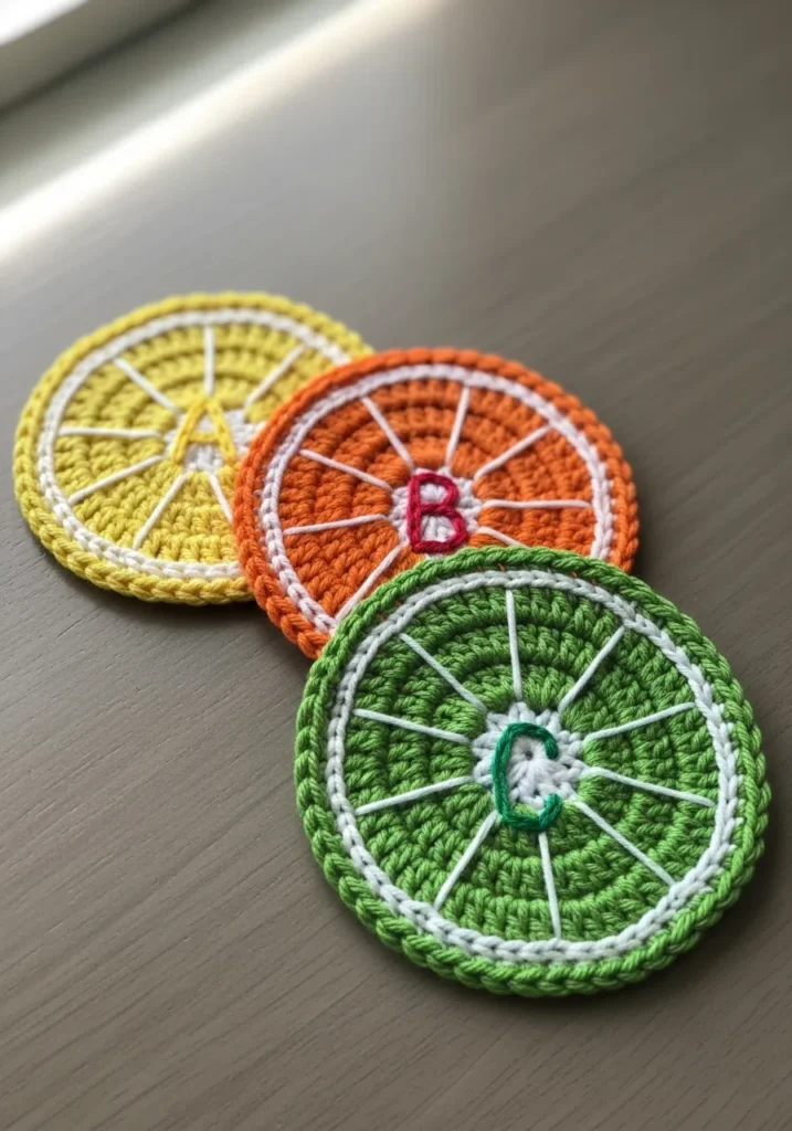 These bright crochet coasters are shaped like citrus slices in lemon yellow, orange, and lime green. Each one features stitched segment lines and a contrasting border that makes the fruit design pop. A single initial embroidered in the center gives each coaster a personalized touch. The texture is flat yet slightly raised at the segments, adding dimension and visual interest.