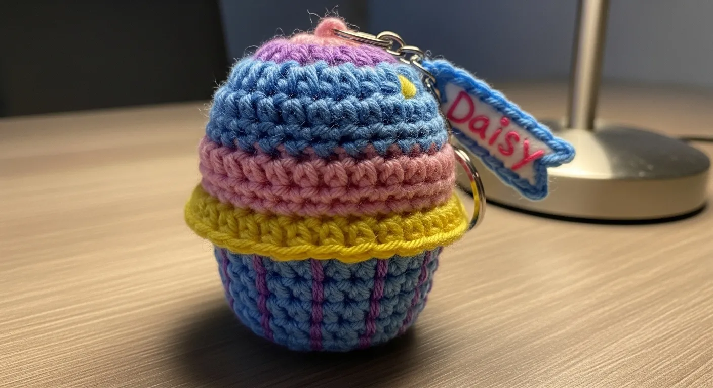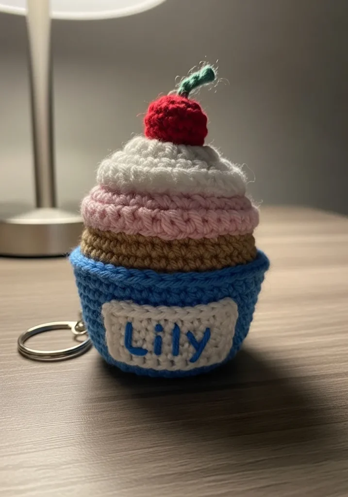This sweet crochet cupcake keychain is made with layered pastel yarns that mimic fluffy frosting and a bright cupcake liner. A tiny cherry detail sits on top, and the name stitched across the base turns it into a mini keepsake. The stitches are tight and neat, giving it a compact shape that holds up well as a keychain. The color combination feels playful and charming.