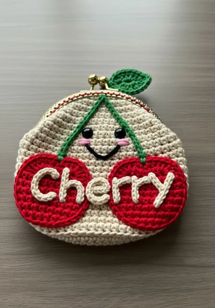 This playful crochet wall hanging features two bright red cherries with smiling faces, stitched onto a neutral round base. The word Cherry is boldly embroidered across the front, making it feel custom and full of personality. The yarn textures create depth between the fruit, leaves, and background, while the small hanging loop at the top makes it easy to display on a simple wall.
