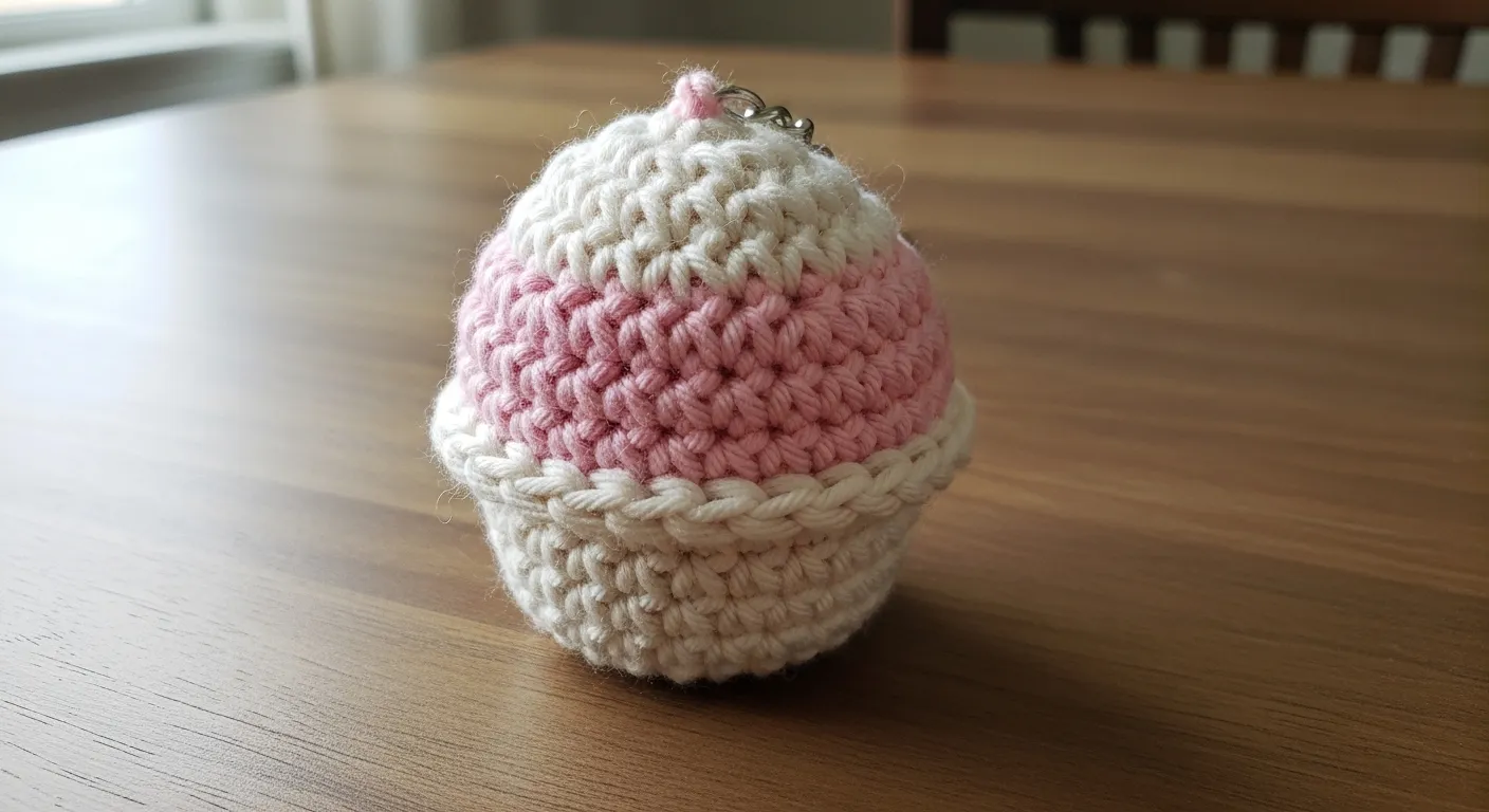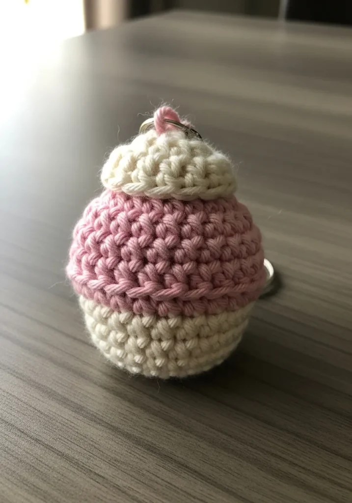 This little treat features a soft cream base topped with a layer of dusty pink frosting and a tiny dollop of white icing on the very top. It is worked in a tight and sturdy single crochet stitch, which gives it a neat and professional look. The cotton yarn provides a smooth texture that feels great in your hand and holds its rounded shape perfectly. It even comes with a small silver ring attached to a tiny pink loop so you can carry it anywhere.