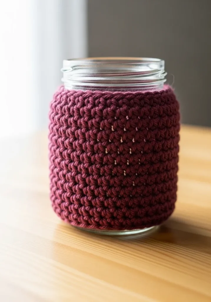 I absolutely adore how a simple sleeve like this can transform a basic kitchen jar into a piece of stylish home decor. It is a brilliant way to upcycle those empty jam or sauce jars into cute pencil holders or vases for wildflowers. If you are looking for a project that takes very little effort but yields a super practical result, then this is a total winner. Additionally, the deep berry color is just so sophisticated and makes the whole DIY look like it came from a trendy farmhouse boutique.