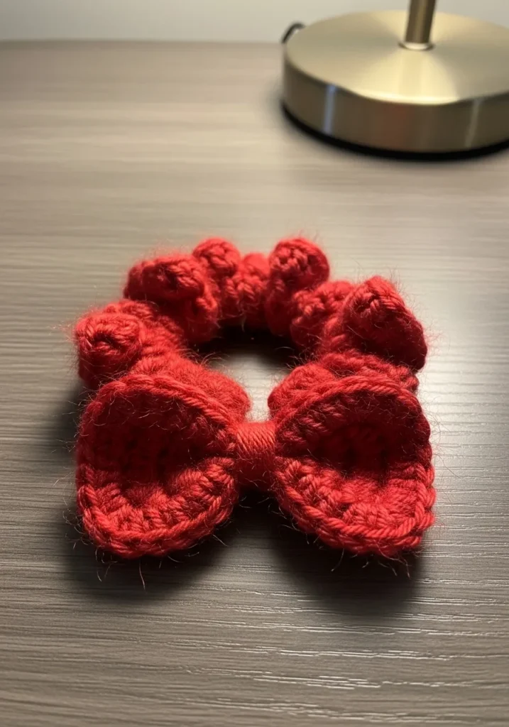 This bold hair accessory is whipped up in a vibrant scarlet yarn with a wonderfully fuzzy texture that looks so soft to the touch. The main band is worked in ruffles around an elastic core to give it that classic voluminous scrunchie shape we all love. Front and center is a beautifully proportioned crochet bow with rounded edges and a tidy center wrap that gives it a professional finished look. The mohair-style yarn adds a slight halo of fluff, which makes the deep red color look rich and luxurious against the dark tabletop background.