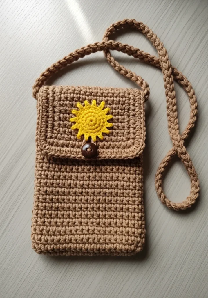 This practical little pouch is worked up in a warm, sandy beige yarn using a dense waffle-like stitch that provides excellent padding for your device. It features a sleek rectangular body with a fold-over flap that stays securely closed thanks to a dark wooden button. To make it pop, a bright yellow sunburst appliqué is stitched right onto the center of the flap, adding a lovely handmade touch. The long strap is made of a sturdy braided crochet cord that feels comfortable across the shoulder and matches the earthy aesthetic perfectly.