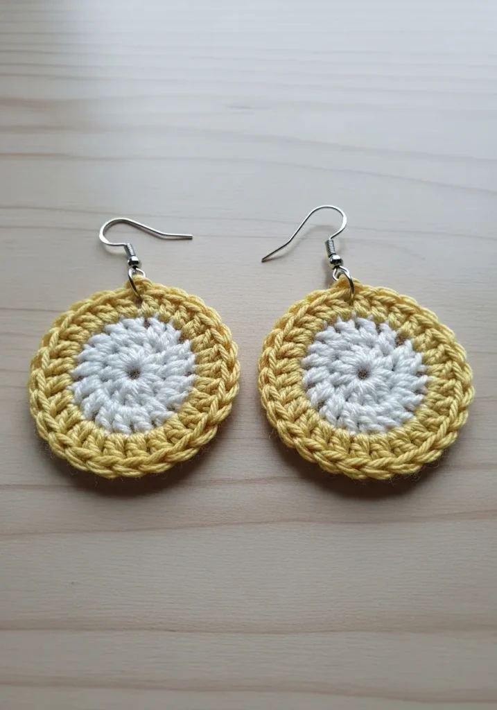 These zesty dangles feature a crisp white center surrounded by a vibrant lemon-yellow ring that perfectly mimics a fresh fruit slice. They are meticulously stitched in a spiral pattern using a very fine cotton thread, which keeps them incredibly lightweight and comfortable for all-day wear. The edges are finished with a clean border of double crochet stitches that give the circles a sturdy and polished shape. To complete the look, they are attached to classic silver fishhook wires that let them catch the light beautifully as you move.
