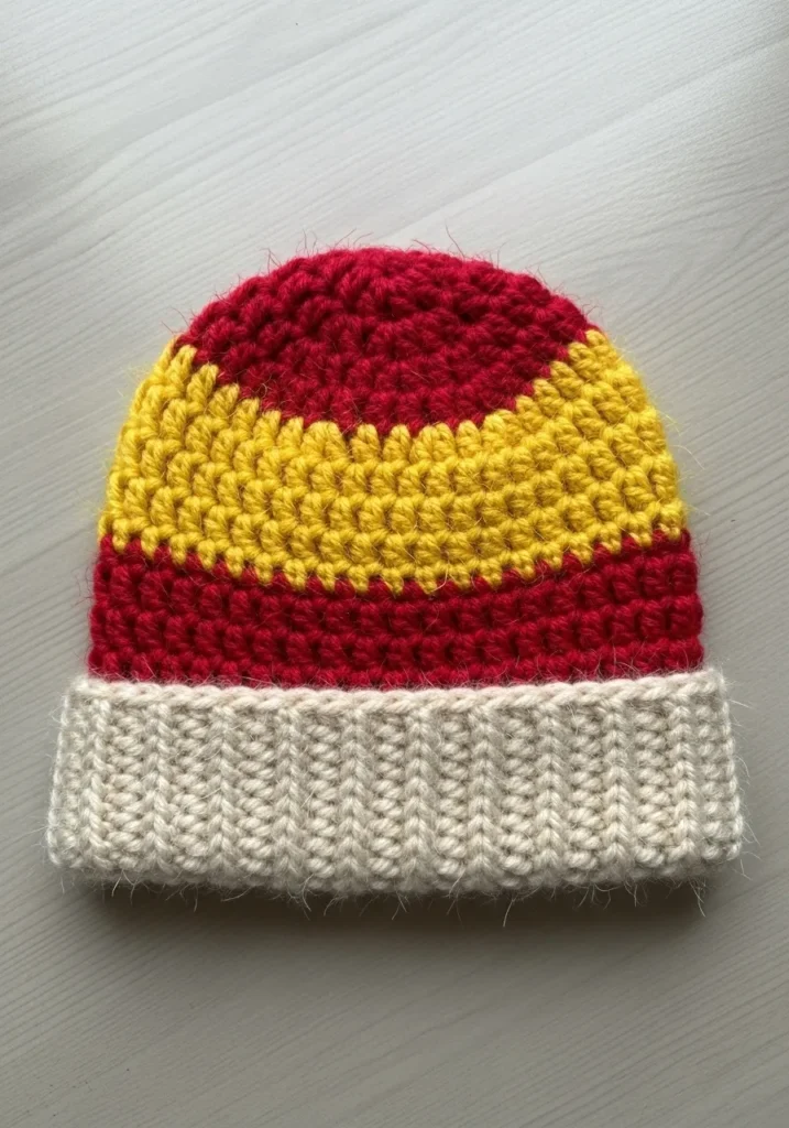 This cozy hat is a masterclass in combining bold colors with classic textures. The body of the cap features wide horizontal stripes in a deep cranberry red and a bright sunflower yellow, worked in a thick and plush stitch that promises maximum warmth. At the base, a chunky folded brim in a natural oatmeal shade provides a wonderful contrast with its vertical ribbing. The yarn used has a gentle fuzzy halo, giving the whole piece a soft, lived-in feel that is perfect for those crisp morning walks.