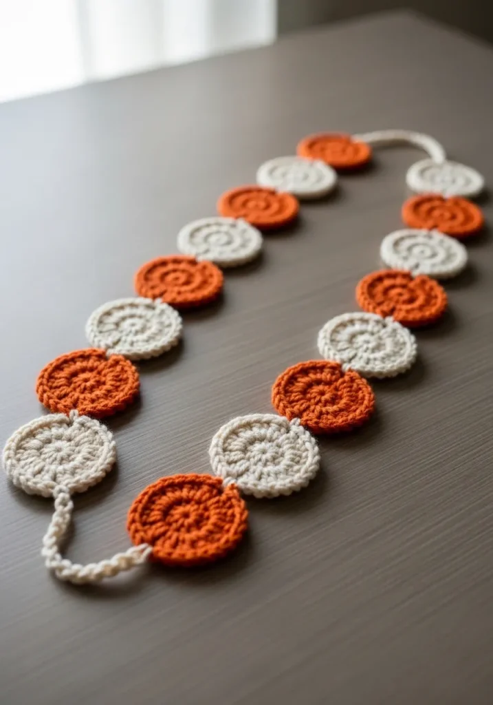 This stylish garland is made up of a series of perfectly round crochet discs in alternating shades of rustic orange and creamy off-white. Each circle is worked in a continuous spiral of double crochet stitches that create a smooth and flat surface with a wonderful radial texture. The discs are joined together by a simple crocheted chain at the edges, and the whole piece ends with a delicate braided loop for easy hanging. Using a matte cotton yarn gives the garland a natural, high-quality feel that drapes beautifully, whether it is strung across a mantle or a nursery wall.