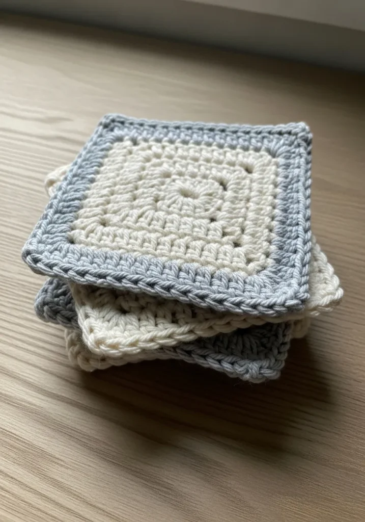 This set of square coasters features a crisp cream center framed by a cool slate grey border. They are whipped up using a sturdy double crochet stitch that creates a thick and absorbent surface for your favorite mugs. The design is clean and geometric with a lovely textured edge that adds a bit of sophistication to your coffee table. Since they are made with a matte cotton yarn, they have a natural and earthy feel that fits perfectly into a modern home.
