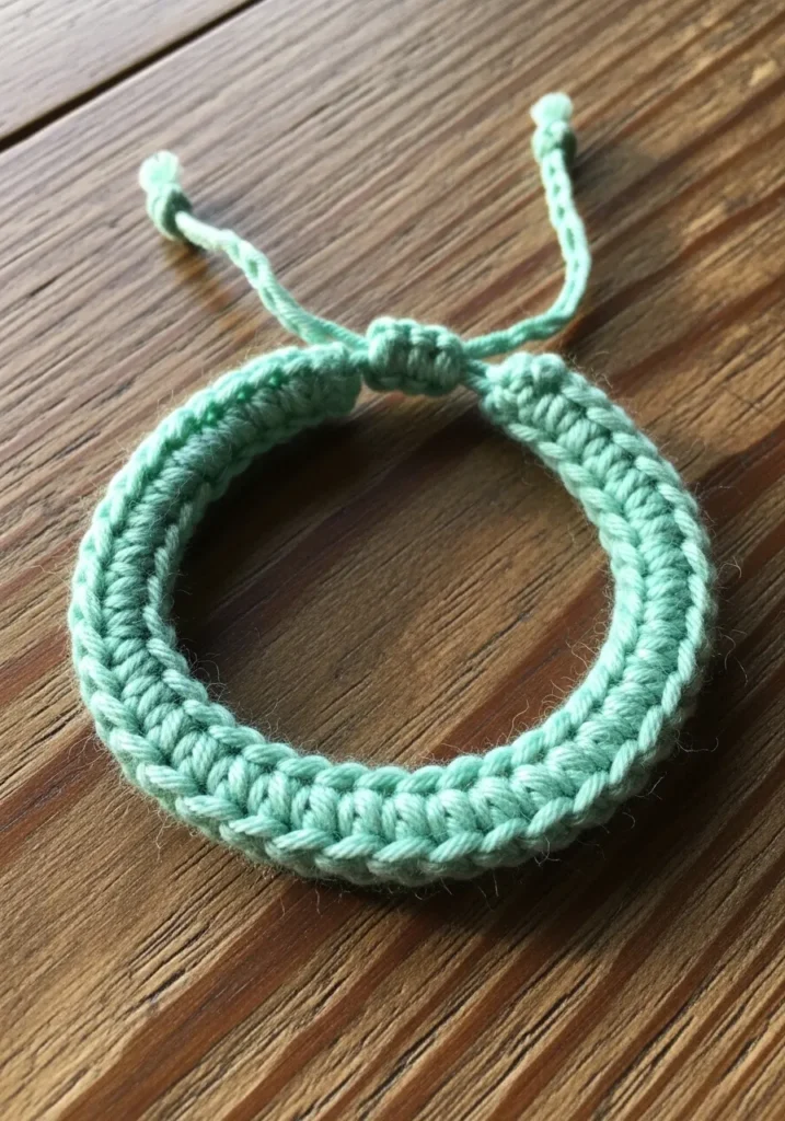 This dainty piece is crocheted in a refreshing mint green shade using a sleek mercerized cotton yarn. The main band features a series of compact stitches that create a sturdy yet flexible cord with a slightly raised ribbed texture along the edges. It includes a clever sliding knot closure made from matching yarn tails, which allows for an adjustable fit on any wrist size. The overall look is understated and organic, making it a versatile addition to a stacked jewelry collection.