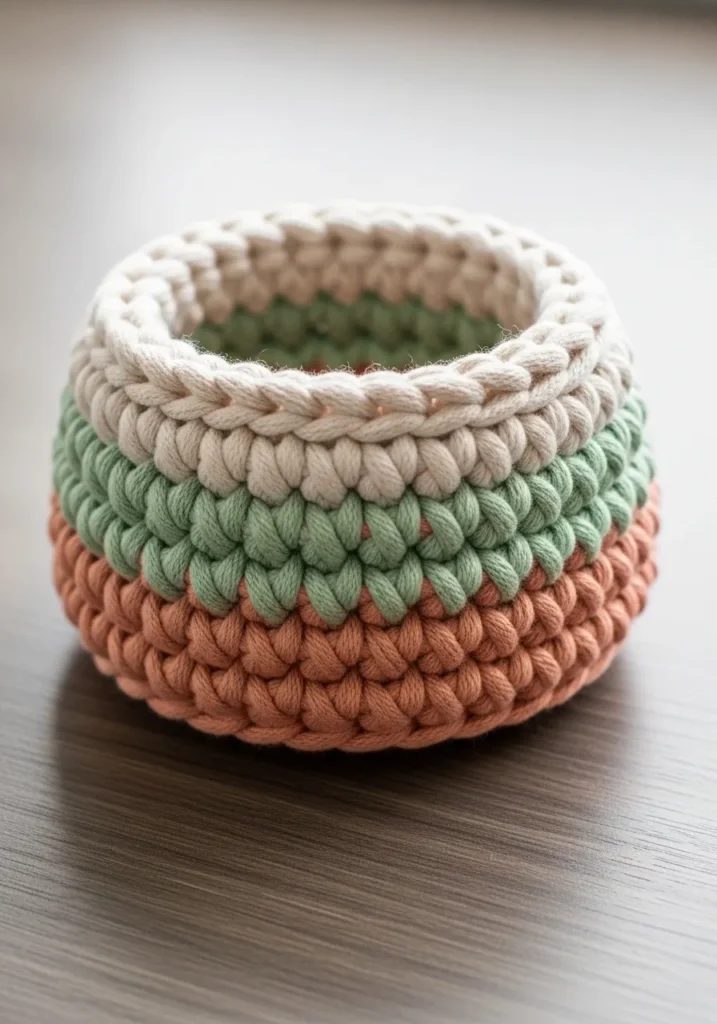 This sturdy little basket is crafted with a thick t-shirt yarn that gives it amazing structure and a modern vibe. The design features three wide bands of color, including a warm terracotta at the base, a sage green center, and a clean cream top edge. Using a large hook and basic stitches results in those wonderfully oversized braided loops that look so high-end on a shelf. It has a slightly tapered opening, which makes it perfect for holding rounder items while keeping everything looking tidy and intentional.