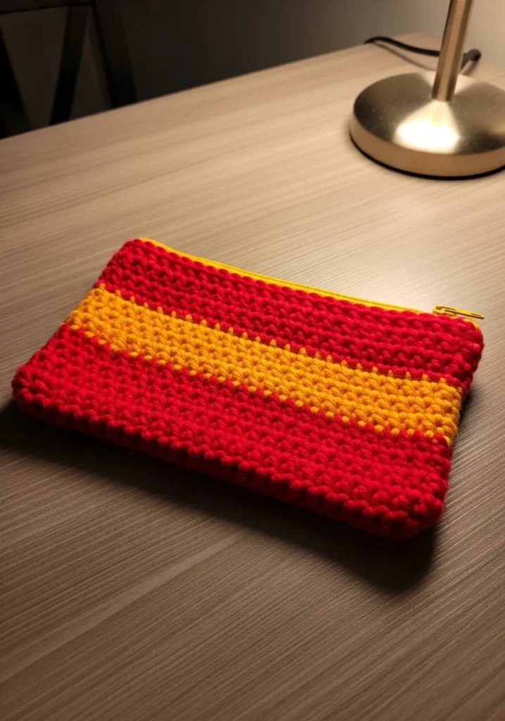 This eye-catching pouch is worked up in a bold fiery red yarn with a thick golden yellow stripe running right through the center. It features a dense and uniform stitch pattern that creates a sturdy fabric ,which is perfect for protecting your essentials. The top is finished with a matching yellow zipper that is sewn directly into the crochet edge for a clean and functional finish. Its flat rectangular shape makes it a sleek choice for throwing into a larger bag or carrying as a small clutch on its own.