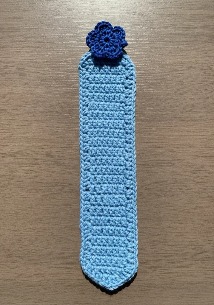 This slender book accessory is whipped up in a calming sky blue yarn with a lovely rounded base that tapers perfectly at the bottom. It uses a combination of half double and double crochet stitches to create a smooth, flat surface that won’t bulk up your favorite novel. At the very top, a vibrant royal blue flower with five petals is firmly attached, acting as a beautiful anchor that peeks out from your pages. The yarn has a slightly glossy finish, which makes the delicate stitch definition really stand out against the wooden background.