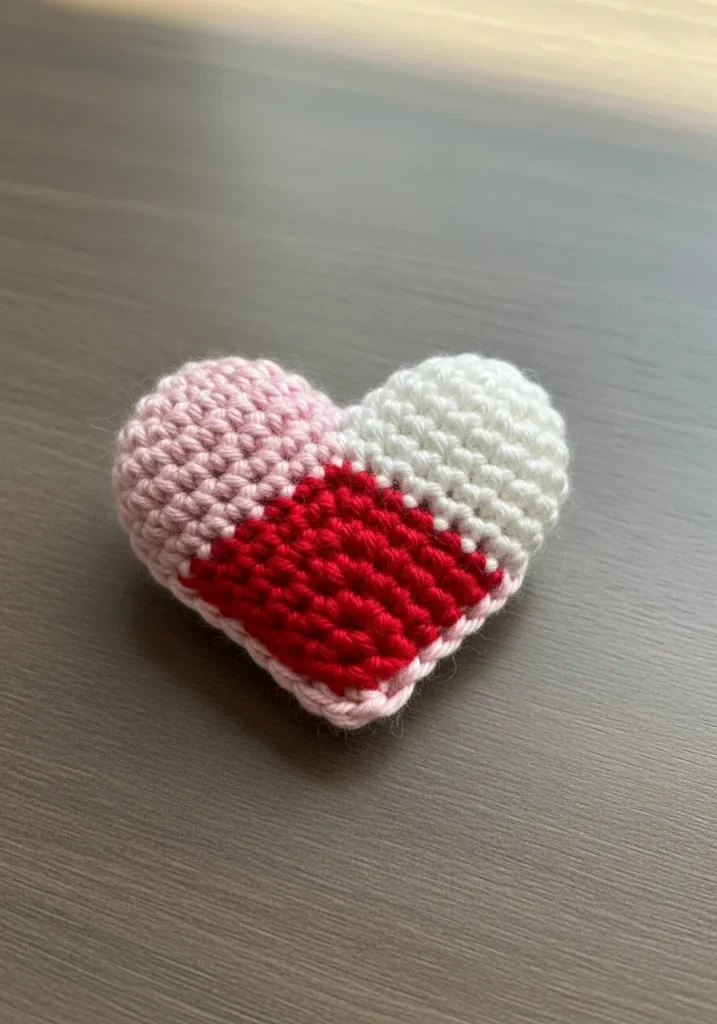 This charming little heart is a perfect example of how much detail you can pack into a tiny project. It features three distinct color blocks, including a soft blush pink on the left side, a crisp white on the right, and a bold ruby red at the bottom point. The stitches are incredibly tight and uniform, which gives the heart a plump and slightly three-dimensional shape that holds its form beautifully. Its smooth yarn finish makes the color transitions look sharp and modern, while the small size keeps it lightweight enough to pin onto even the thinnest fabrics.