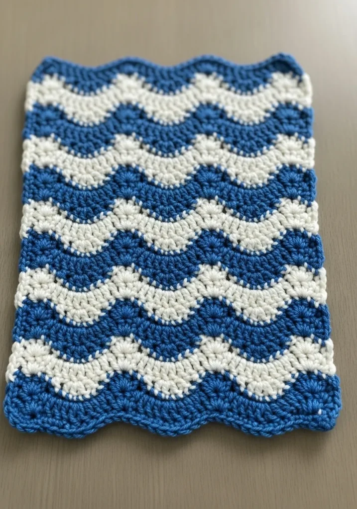 This ripple stitch crochet dishcloth is worked in alternating stripes of deep blue and creamy white, creating that classic ocean wave effect. The scalloped edges naturally form from the stitch pattern, giving it a soft and playful silhouette. The yarn texture is clearly visible, with subtle stitch variations that make it feel cozy and handmade rather than overly polished.