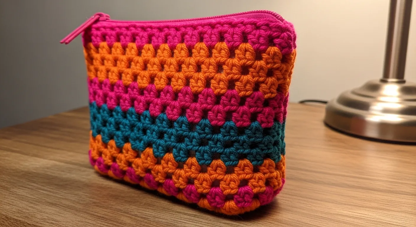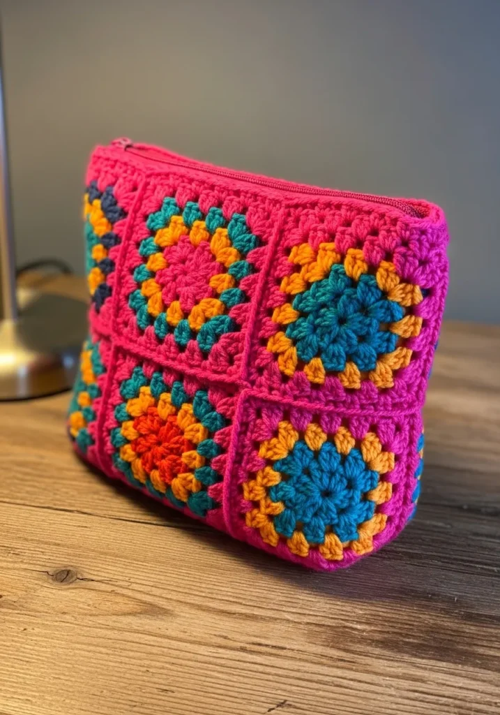 This vibrant zipper pouch is made from bright granny squares in hot pink, teal, orange, and yellow. The bold color blocking and classic square motifs give it a cheerful retro vibe, while the sturdy stitches hold its structured shape. The zipper at the top makes it functional as well as fun.