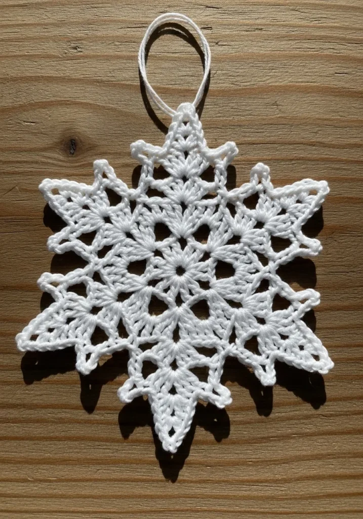 This intricate white crochet snowflake features openwork stitches that create a lacy, symmetrical design. The pointed edges and airy center give it that frosty elegance, while the visible stitch texture keeps it feeling handcrafted and cozy. The hanging loop makes it ready to display.