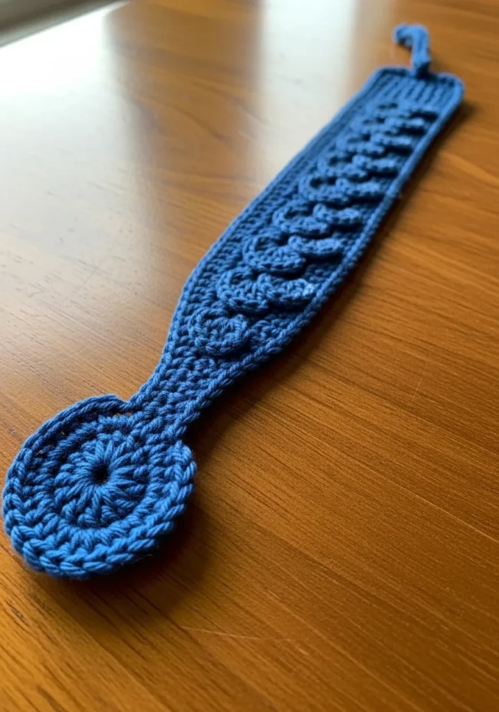 This deep blue crochet bookmark has a round medallion at one end that flows into a narrow textured strip with raised stitch details. The elongated shape is slim and practical, while the stitch definition gives it visual interest without feeling fussy. It lies flat with a clean, finished edge.