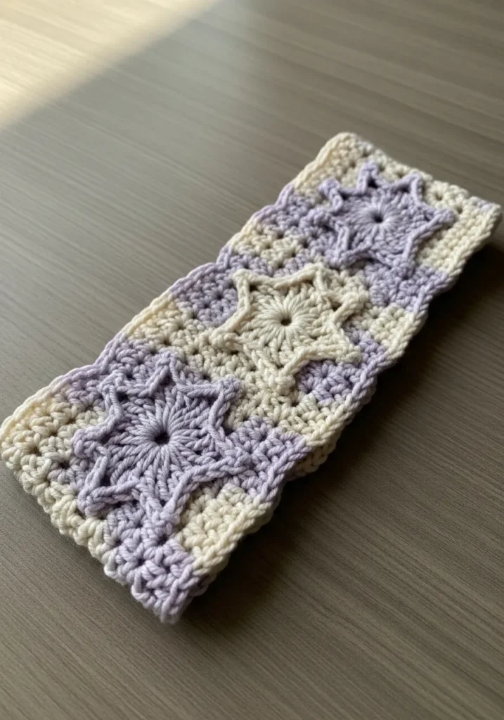 This cozy headband is made from delicate granny squares in soft lavender and cream tones, joined neatly into a flat band. The floral inspired centers give each square dimension, and the slight texture variation adds that handmade warmth. The edges are clean and comfortable for everyday wear.