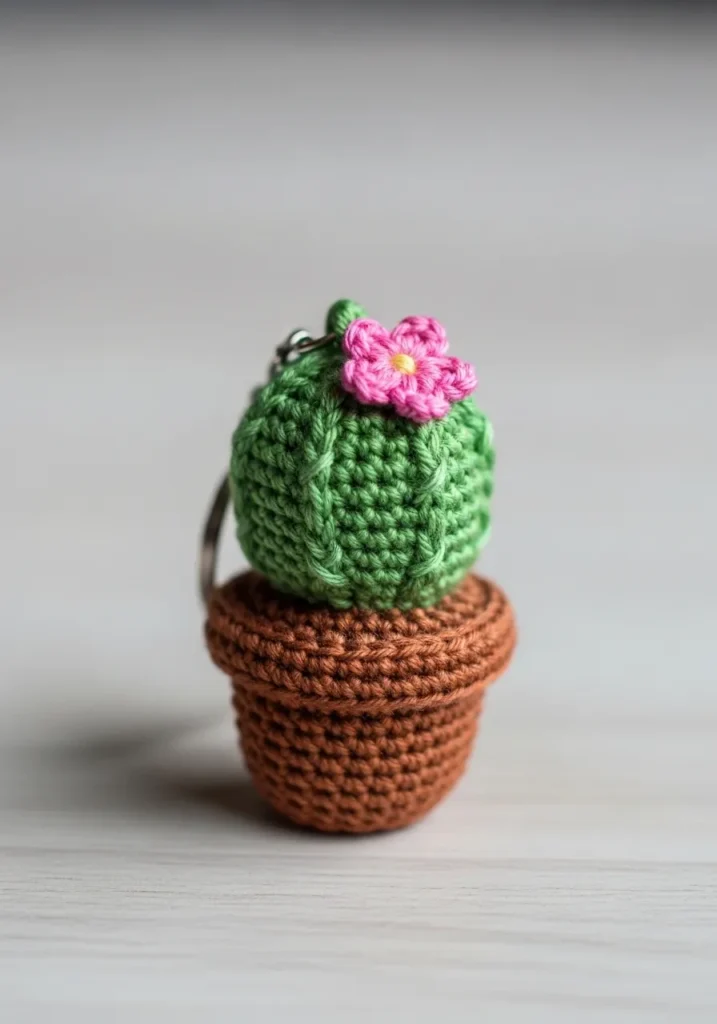 This adorable cactus is stitched in rich green yarn with subtle ribbed texture to mimic real cactus ridges. It sits snugly inside a tiny brown crochet pot, topped with a small pink flower for a pop of color. The rounded form and compact size make it irresistibly cute.